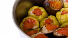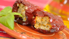 Сухи червени чушки, пълнени с ориз и лук