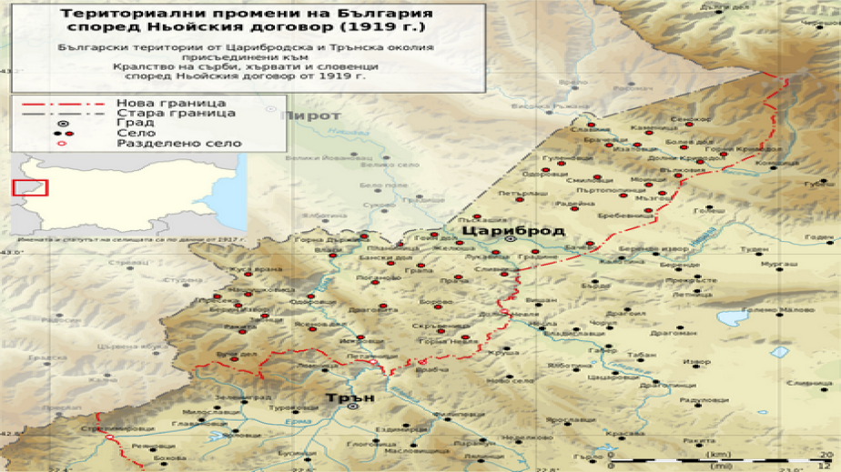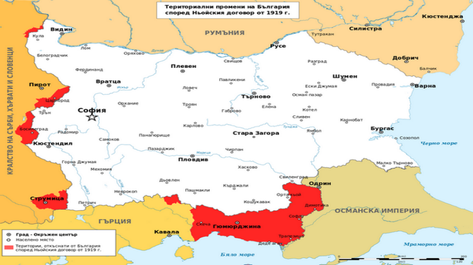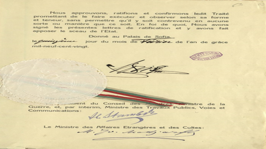 На страната ни са наложени непосилни репарации: 2,25 милиарда златни франка, хиляди глави добитък, 50.000 тона въглища. Отнети са й обширни територии. Последствията от договора историците наричат втора национална катастрофа.