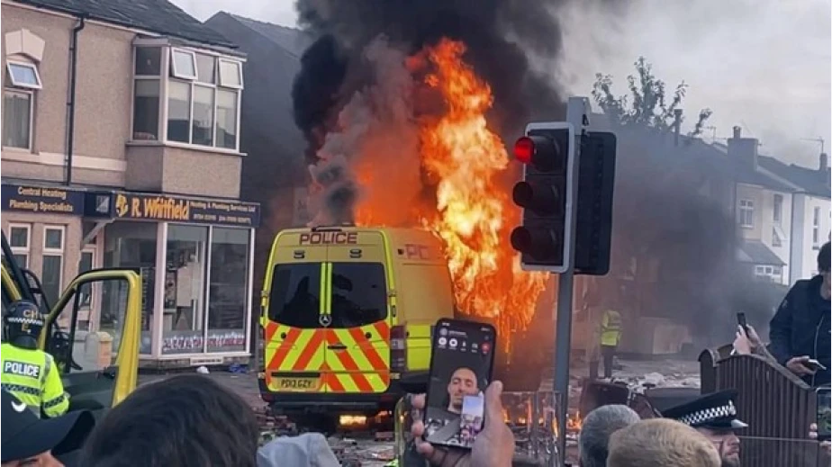 Участниците в размириците, сред които е имало има и привърженици на крайнодясната Английска лига за защита, са запалили полицейски бус и автомобили на граждани, хвърляли са тухли по местната джамия и са повредили магазин.