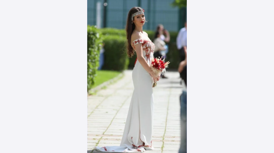 Илияна е издокарана за тържеството си с бяла рокля, която в горната част е изпъстрена с традиционна българска шевица. Момичето стиска в ръце не огромен букет от скъпи цветя, а скромна китка от рози. Накит от сребърни парички краси и без друго хубавата й глава