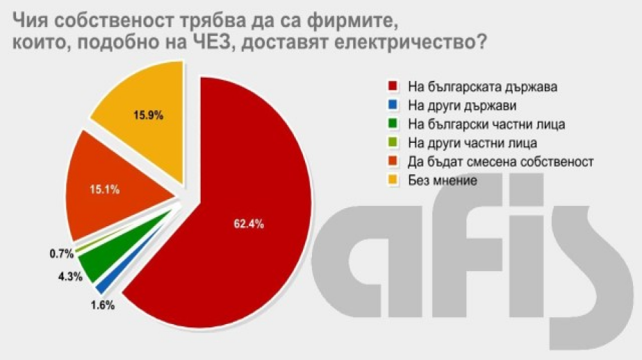 АФИС в дълбоки подробности анализира причините 62,4% от анкетираните да настояват електрото да е държавна собственост, а само 5% да подкрепят частната собственост (родна или чужда) и други 21% да настояват за смесен модел. Според авторите на проучването в случая имаме преминаване от чужда държавна собственост към българска част, което не се приема от симпатизантите на всички партии и така отпадат аргументите за ксенофобско отношение към инвеститорите, политическо заиграване и т.н.
