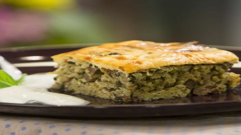 Заливката се приготвя като киселото мляко се разбива с яйцата и брашното, сместа се разпределя върху ястието и се допича за още 15 минути. По желание се поднася с кисело мляко. /Рецепта на kaufland.bg