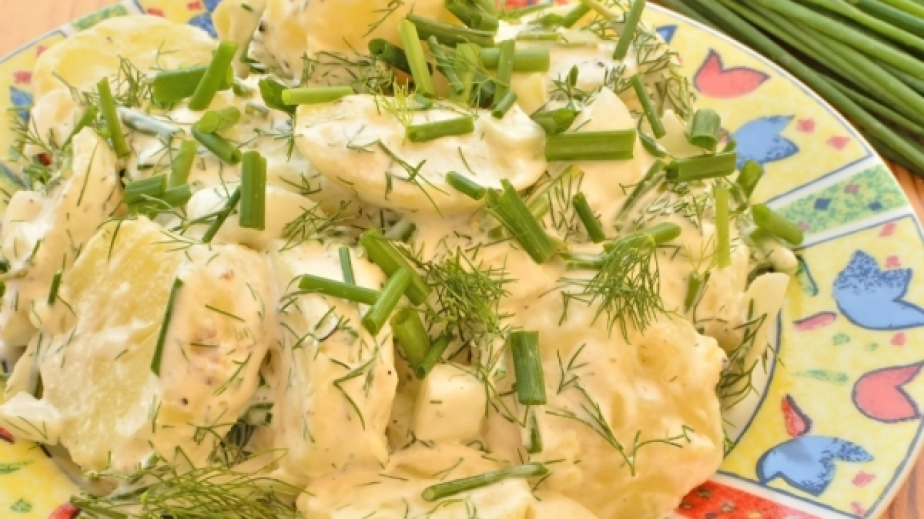 Обелете и нарежете на кубчета сварените картофи. Посолете ги леко и ги сложете да се запържат в предварително сгорещената мазнина в тиган.След като хванат приятен загар, излейте сметаната. Разбъркайте за няколко минути с нея, овкусете с подправки и накълцан копър и зелен лук.