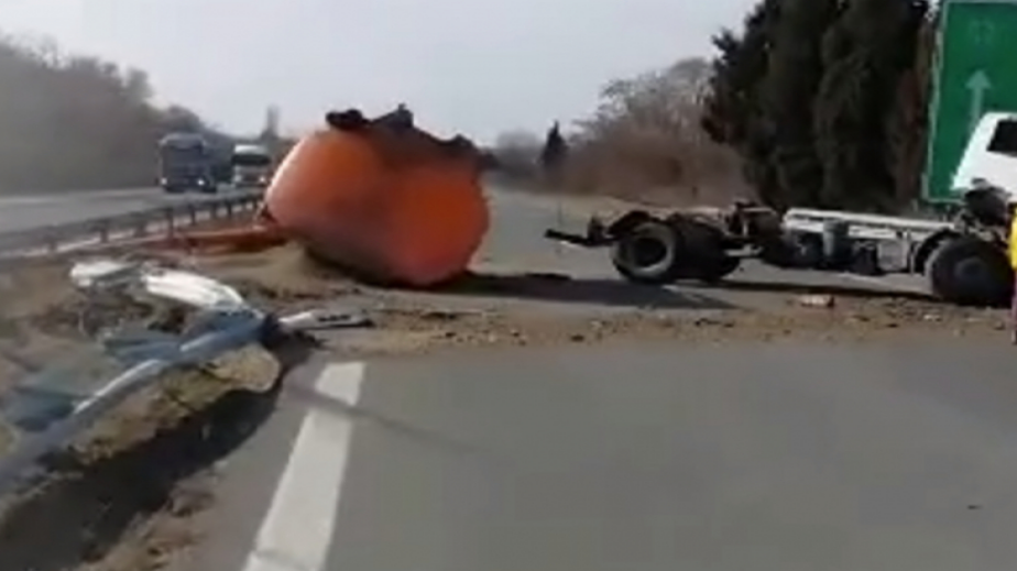 На пътя в момента са се разпръснали слънчоглед и смески, а АМ „Хемус” е затворена временно.Образувало се е огромно задръстване от автомобили в посока Девня.