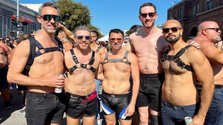 Публичната голота е разрешена в района по време на фестивала. На снимката Уинър позира без риза до група други мъже с препасани кожени колани.