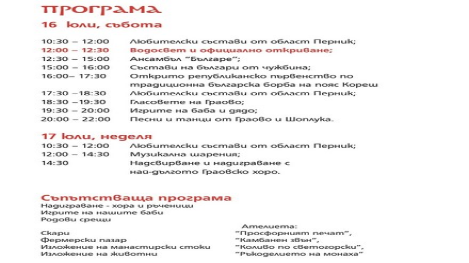 В неделя на 17 юли, комик №1 на България Шкумбата ще развесели граовци така, както само той умее. Около 14:30ч. се очаква да се извие най-дългото граовско хоро, НАРЕЧЕНО за сплотеност и заедност, за създаване на общност, която обича традициите, фолклора и предава любовта към родния край на децата си. Послание, което организаторите формулират от началото на подготовката за събора и ще предадат на всички посетители на събитието.