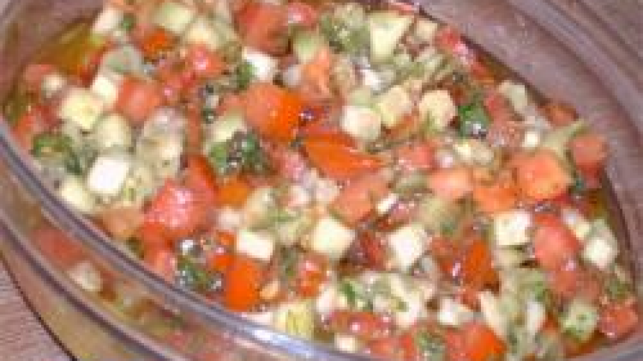 Приготвяне:Счукайте със сол чесъна,чушката и зеленията дополучаване на кашица. Нарежете зеленчуците на малки кубчета 0.5х0.5см., лекосмачкайте с ръка, за да се отдели сок, добавете счуканите подправки, зехтинаи лимонов сок на вкус. |
