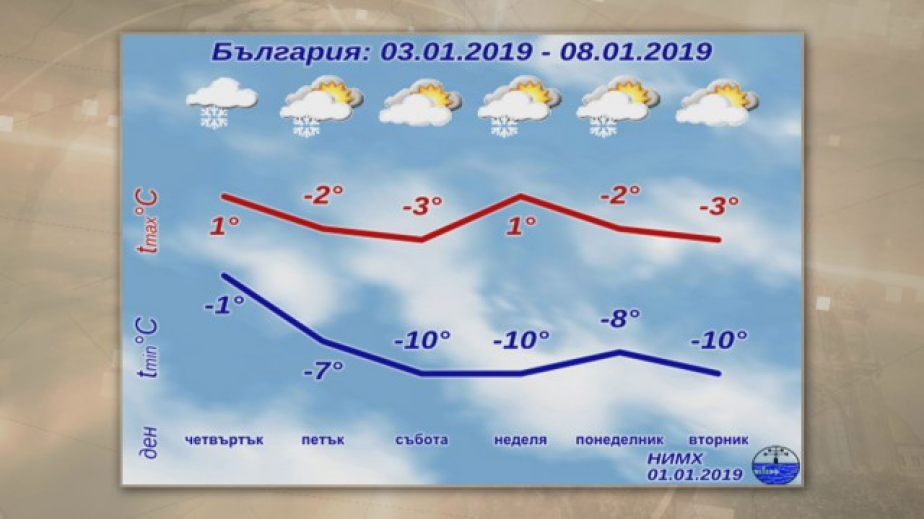 Синоптикът заяви, че през студения период максималните температури в страната ще се понижат до -5 – 0 градуса. Сутрешните температури ще достигнат от -12 до -7 градуса, а в отделни райони е възможно да бъдат и по-ниски.