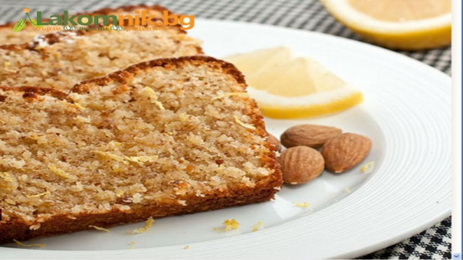 Пасирайте бадемите на ситно. Измийте лимона, сложете го в гореща вода за 2-3 минути и настържете кората. От половината сок изцедете сока, прибавете към разтопеното масло, добавете захар, лимоновата кора и разбийте. Добавете яйцата, добавете брашното и бакпулвера.