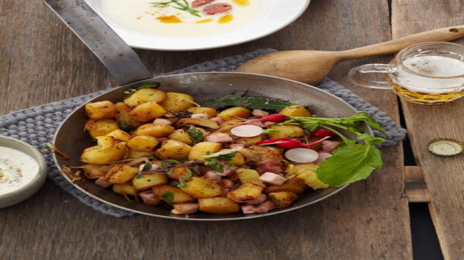 Картофите, без да се белят, се сваряват в подсолена вода заедно с кима и дафиновите листа за 15-20 мин. Отцеждат се и се оставят напълно да изстинат.