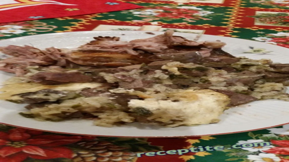 Сокът от лимона, зехтинът, червеният пипер, мащерката, салвията, розмаринът, солта и черният пипер се разбъркват в купичка. Агнешкото месо се измива и се подсушава. Намазва се хубаво с подправките и се оставя да отлежи една нощ в хладилника. От лимоновият сок месото става много крехко и ароматно. Пресният лук и джодженът се нарязват на ситно и се поставят в глинен гювеч (може да се пече и в йенска тенджера или тава с фолио, но най-вкусно става в пръстен съд). Агнешкото месо се поставя върху тях, поръсва се с парченца масло и се наливат 2 ч.ч. гореща вода. Затваря се с капак и се пече в умерена фурна за 1 час. Изважда се от фурната, поставя се добре измитият ориз, налива се 1-2 ч.ч. гореща вода и отново се запича под капак 20-30 минути./Рецептата е взета от receptite.com