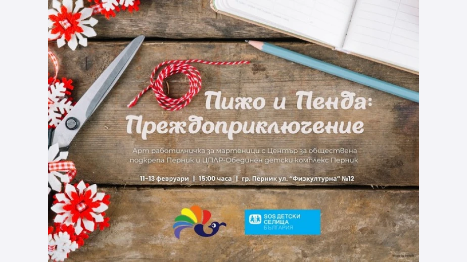 В дните от 11 до 13 февруари в Перник ще се проведе арт-терапевтична работилница за изработка на мартеници, организирана съвместно от ЦПЛР-Обединен детски комплекс Перник и Център за обществена подкрепа Перник към Сдружение SOS Детски селища България. Събитието ще се състои от 15:00 ч. в сградата на Обединен детски комплекс, а участие могат да вземат както деца, така и техните родители.