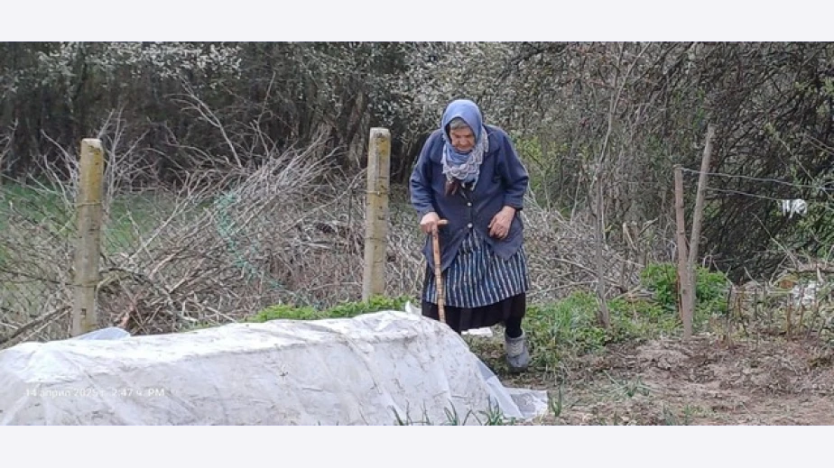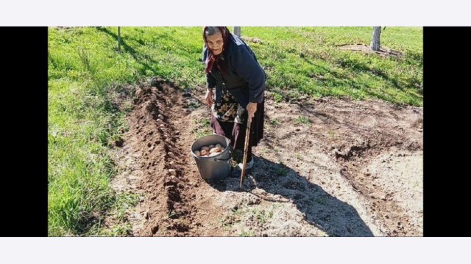 Баба Даринка Иванчева от трънското село Ярловци на 93 години продължава да се грижи за зеленчуковата градина. Сама е засяла лехите с разсад от домати и пипер, приготвила е и кофички с разсад. Когато е слънчево и топло времето, открива лехите, ако застудее отново ги покрива. През последните дни баба Даринка използва топлото време и засади картофите. Подпряна на бастунчето тя ги поставя в браздата в редичка.