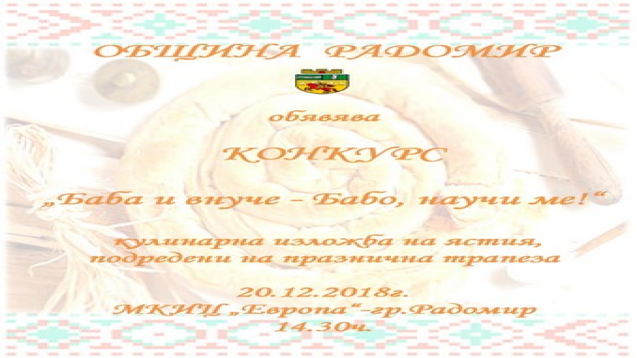 За втора година община Радомир организира кулинарна изложба на ястия, подредени на празнична трапеза под надслов "Баба и внуче - бабо, научи ме". Баби заедно с внучетата си ще покажат кулинарните си умения в конкурса на 20 декември от 14:30ч. в МКИЦ „Европа“. В надпреварата бабите ще демонстрират как предават готварските си умения на своите внуци.