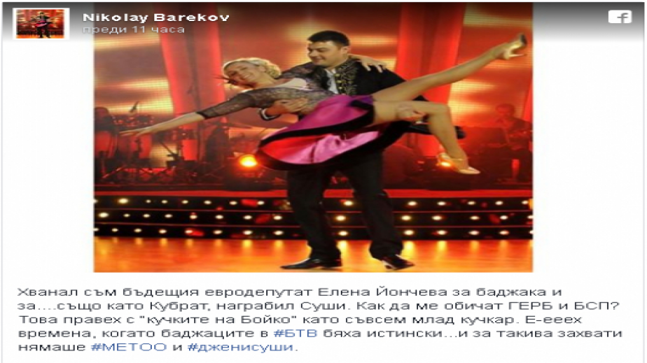 "Как да ме обичат ГЕРБ и БСП? Това правех с “кучките на Бойко” като съвсем млад кучкар...", написа той. "Хванал съм бъдещия евродепутат Елена Йончева за баджака и за....също като Кубрат, награбил Суши. Как да ме обичат ГЕРБ и БСП? Това правех с “кучките на Бойко” като съвсем млад кучкар. Е-ееех времена, когато баджаците в #БТВ бяха истински...и за такива захвати нямаше #METOO и #дженисуши.