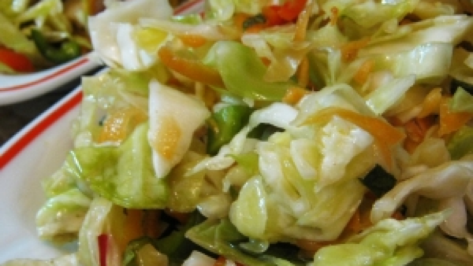 Салата от печени чушки и орехи върху краставица