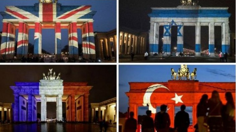 Подобно на Айфеловата кула в Париж, кметството на Тел Авив и други емблематични сгради, Бранденбургската врата е била осветявана в националните цветове на други страни като израз на солидарност след терористични нападения.
