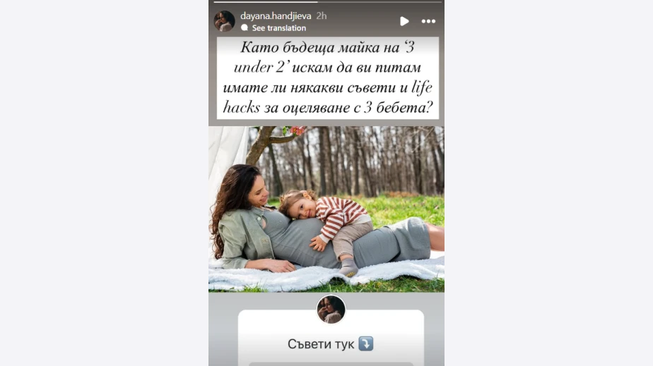 Даяна Ханджиева, позната на зрителите на bTV с участието си във "Фермата" и сериала "Столичани в повече", ще става майка на близнаци. Актрисата, която стана майка на син Антони в края на 2023 година, сподели индиректно новината в социалните мрежи, където написа: