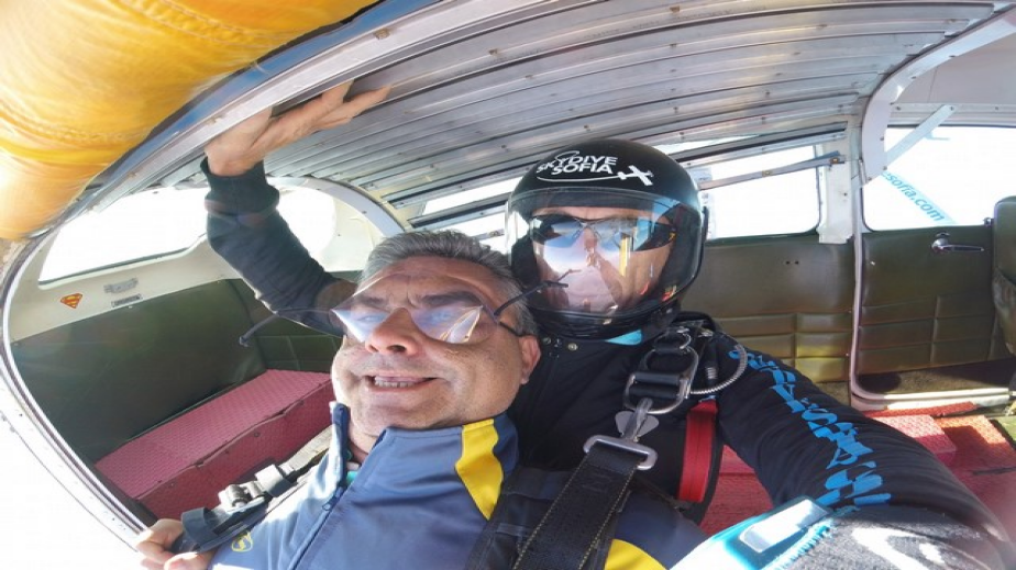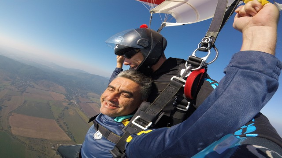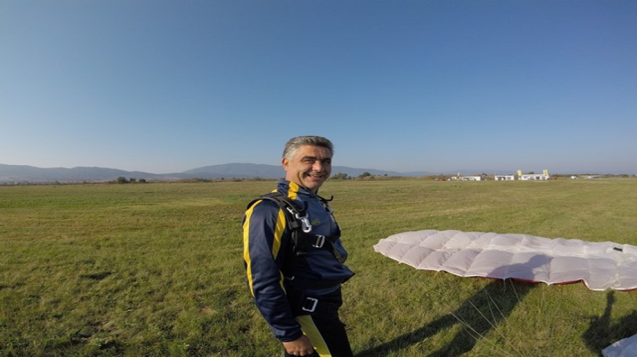 Бившият председател на Общинския съвет в Перник и зам.-директор на „Топлофикация – Перник“ скочи с парашут. Екстремното изживяване му бе подарък от съпругата му Милена за 50-годишния му юбилей.