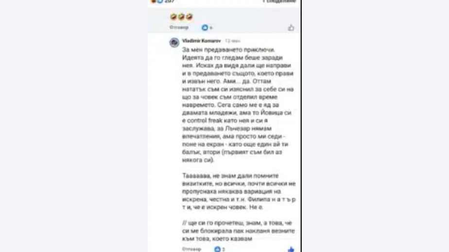 „Исках да видя дали Филипа ще направи и в предаването същото, което прави и извън него. Ами… да. Оттам нататък съм си изяснил за себе си на що за човек съм отделил време навремето. Сега само ме е яд за двамата младежи, ама то Йовица си e control freak като нея и си я заслужава. За Лъчезар нямам впечатления, ама просто ми седи – поне на екран – като още един IT балък – втори (първият съм бил аз някога си).