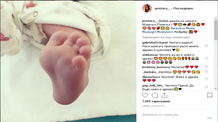 "Добре дошла на нашата Малечка-Палечка!". Това написа певицата, качвайки снимка на бебешко краче в личния си профил в "Инстаграм".