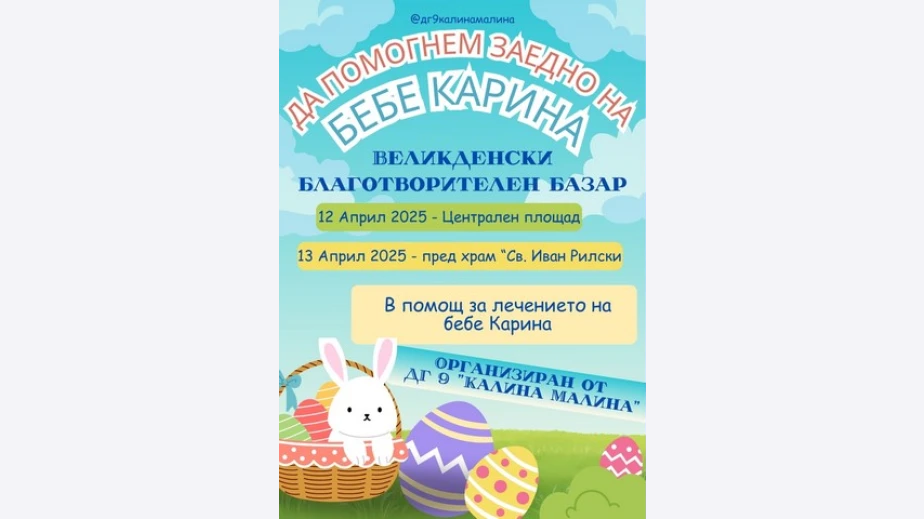 На прага на най-светлия християнски празник, перничани ще имат възможност да направят едно истинско добро дело. ДГ №9 „Калина Малина“ организира Великденски благотворителен базар в подкрепа на бебе Карина – дете, което още в началото на живота си е изправено пред тежко изпитание.