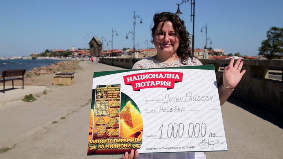 Донка Райчева от град Несебър е най-новият милионер от Национална лотария. Щедрият билет „Златните пирамиди за милиони“ ѝ донесе фантастичната печалба от 1 000 000 лева. Късметлийката е шестият милионер от Национална лотария от началото на годината.