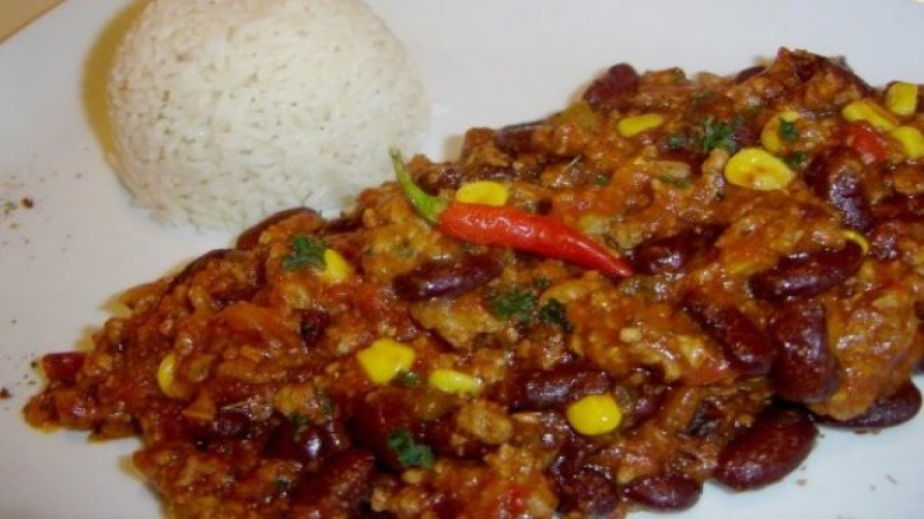 Запържете до омекване лука в 1 с.л. олио в дълбок тиган или тенджера. Добавете телешкото и чесъна и оставете на средно силен огън, докато сместа започне да покафенява. Овкусете със сол и пипер. Отцедете излишната от пърженето мазнина. Добавете нарязаните домати, боба и чилито. Разбъркайте добре, сложете капак и варете на слаб огън, около час.