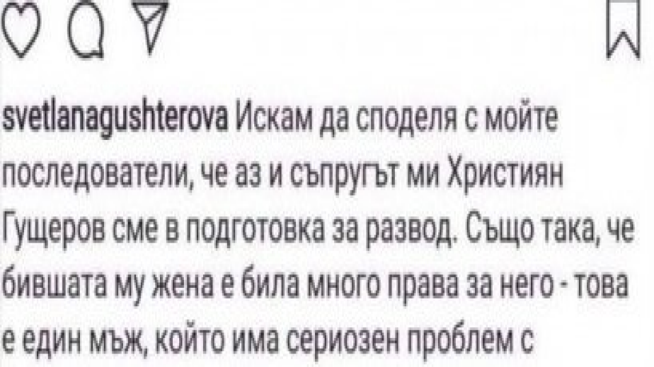 "Искам да споделя с мойте последователи, че аз и съпругът ми Християн Гущеров сме в подготовка за развод. Също така, че бившата му жена е била много права за него - това е един мъж, който има проблеми с алкохола и баща, който не си поглежда детето. Мисли си, че след като плаща за гледачки и шофьор на детето, е достатъчно. Жал ми е и ми е мъчно, че детето няма баща, който дори един път не му смени памперса и не е поседял с дъщеря си дори 2 часа.