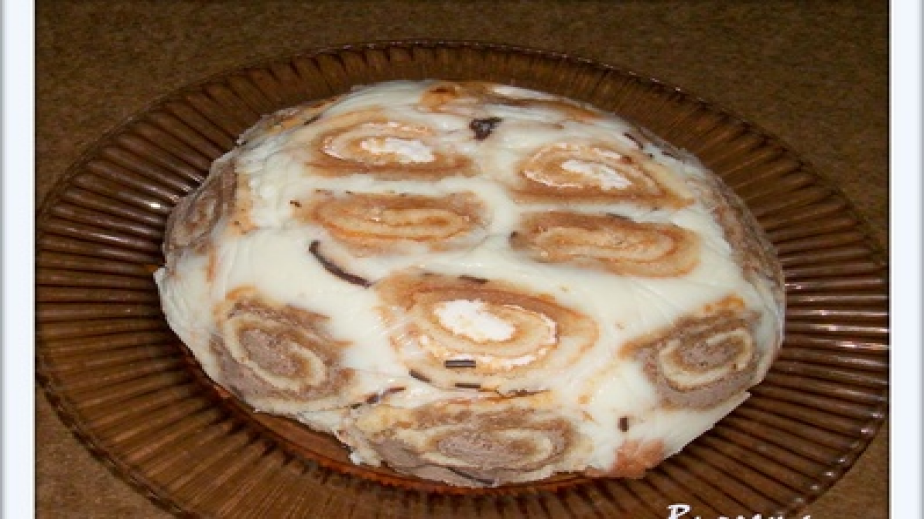 След като крема се охлади в подходящ съд наредете половината от нарязаните рула, залейте с 2/3 от крема, наредете останалите филийки и завършете с останалия крем.