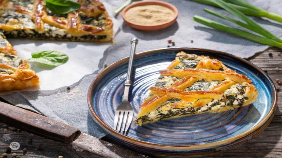 Изсипете вътре спаначената смес, отгоре кръстосайте ленти от бутер тесто, намажете ги с останалия жълтък и изпечете пая на 200 градуса за 30 минути. / Рецепта на matekitchen.com