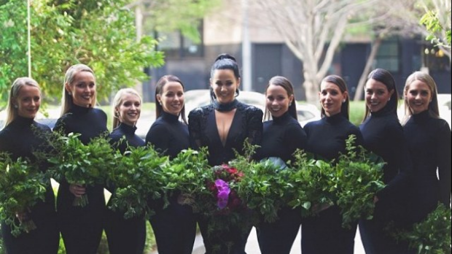 Не само че булката носи черно, но и всичките й шаферки. Традицията е нарушена и що се отнася до букетите на придружителките – те държат в ръцете си само зеленина.
