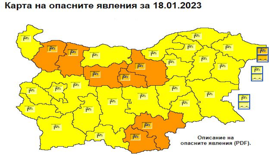 В 7 области е обявен оранжев код за силен вятър- Монтана, Враца, Велико Търново, Ловеч, Габрово, Кърджали и Хасково. В останалата част на страната кодът е жълт.