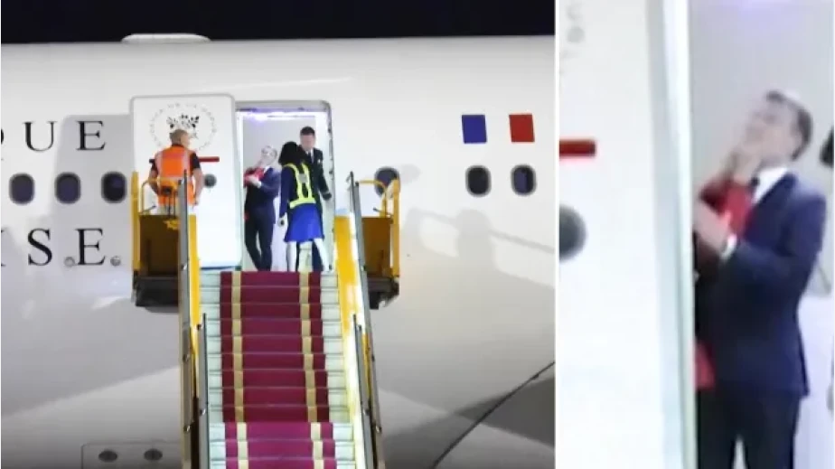 Видеото, след като самолетът на френския президент каца, показва как 72-годишната Брижит Макрон поставя двете си ръце върху лицето на съпруга си, преди да го блъсне силно.