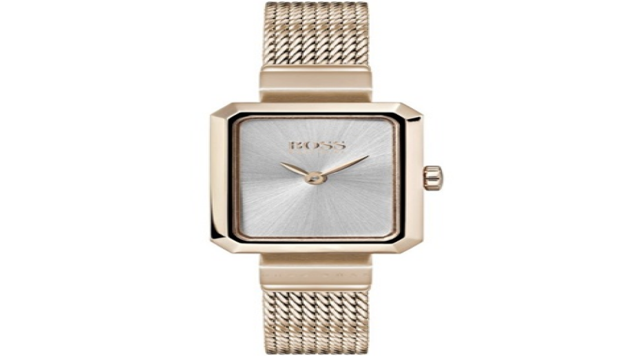 Ненатрапчиво изписаното лого на Hugo Boss бегло изпъква под стрелката на 12 часа, за да отведе погледа към плетената метална верижка в златист загар, завършвайки визията на най-красивия часовник за сезона.