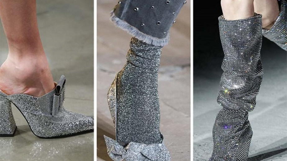 Време е да получим доза блясък през тези есен и зима. Виждаме много сребърни и блестящи комбинации като цяло, което прави среброто официален тренд за обувката за студения сезон 2017-2018. Ботуши и сандали получават ефекта “bejeweled”.