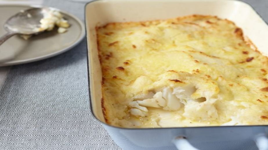 Сварете картофите в подсолена вода. Обелете сварените картофи и ги смачкайте. Върнете ги на котлона, овкусете със сол и черен пипер като постепенно добавяте маслото и сметаната. Гответе докато маслото се разтопи и сместа стане гладка. Намажете рибата с малко масло и овкусете със сол и черен пипер. Сложете рибата в подходяща тава и поръсете със счукания чесън. Отгоре разстелете равномерно картофеното пюре. Печете в предварително загрята на 180С фурна за около 30-35 минути.