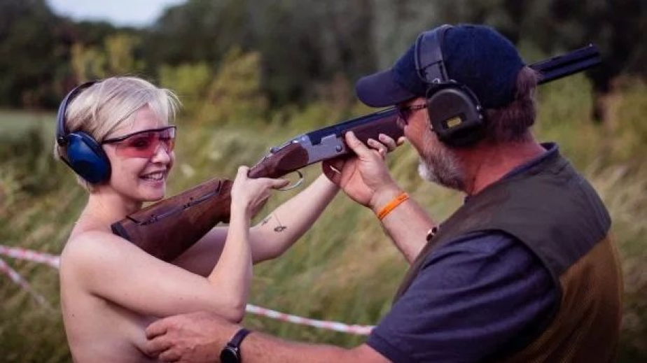 Авторката стреля по глинени чинийки