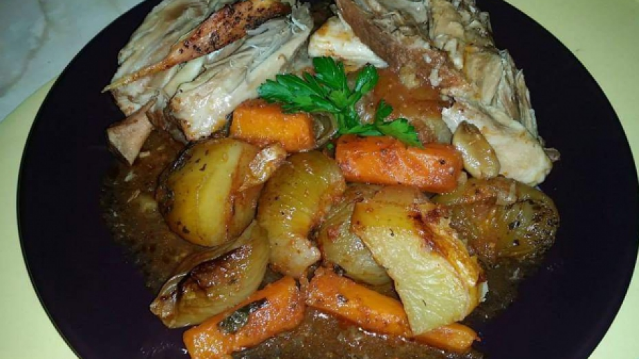 Сложете капака и печете на 220 градуса, докато заври (около 40 мин), след това намалете градусите на 120 и задушавайте 5 часа.