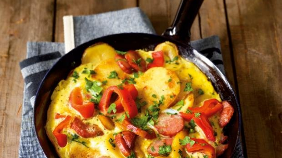 Яйцата се разбиват със сол и черен пипер. Изливат се върху картофите.