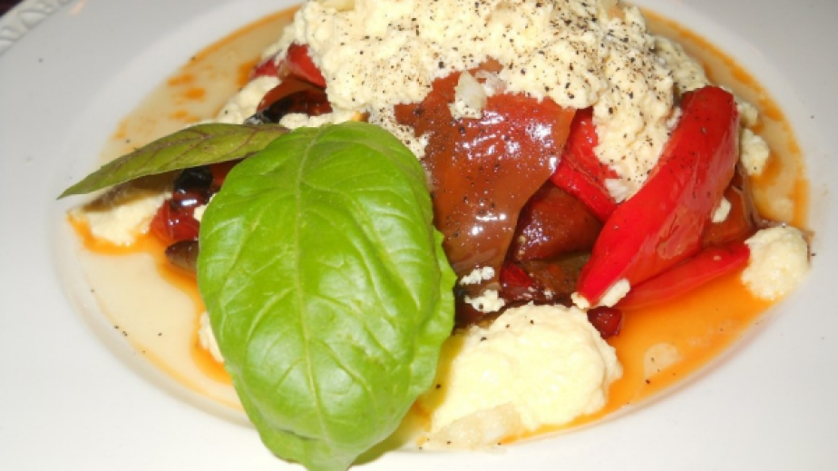 Изпечете чушките и ги задушете в плик, за да се обелят по-лесно. Отстранете семките и ги нарежете на лентички.