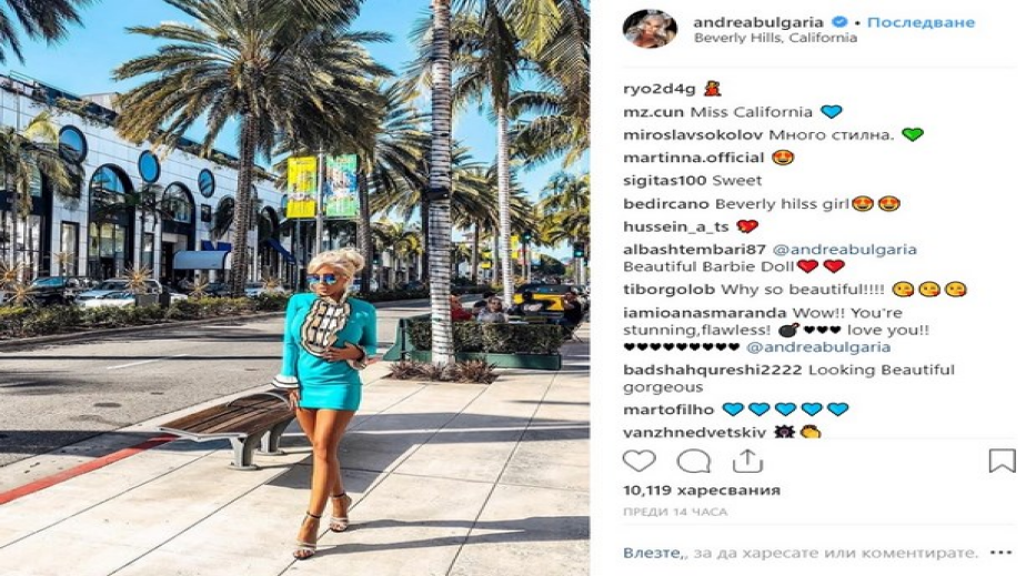 Половинката на Кубрат Пулев Андреа вече е в Калифорния. Певицата се похвали със снимка в социалните мрежи от Бавърли Хилс, което е само на час път от Коста Меса, където наскоро любимият й се замеси в чутовен скандал, като целуна репортерката Джени Суши след интервю.