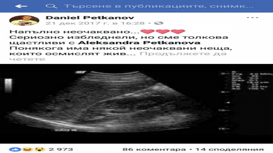 Лудия репортер Даниел Петканов сподели с последователите си в социалните мрежи новина, която предизвика у едни радостни възгласи, докато други останаха скептици. "Нямах търпение да споделя с вас дългоочакваната новина!!! С Александра ще си имаме дете. Бременен съм в 4-тия месец ", написа Петканов и предизвика вълна от коментари в мрежата.