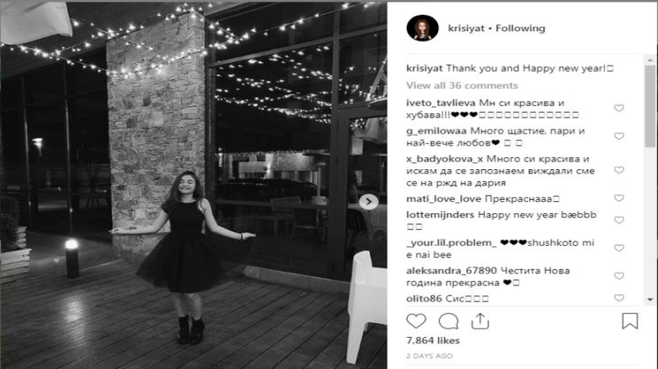 Тодорова най-вероятно е със семейството си, въпреки че те не присъстват на нито една нейна снимка от вечерта в социалните мрежи. На кадрите Крисия се смее, кифлее, издувайки устни напред и даже позира горещ минерален басейн сред природата.