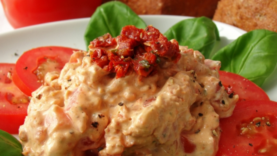 Почистете доматите, разполовете ги и извадете семенната част внимателно. Твърдата част нарежете на ситни кубчета. Оставете ги да се отцедят за няколко минути.Пасирайте киселото мляко, крема сиренето, като доливате постепенно зехтин. Количеството му може и да е повече от посоченото.Разбъркайте млечната смес с доматите, нарязан босилек, риган, сол и бял пипер на вкус. Разпределете сместа в 2 чинии и по средата поръсете със ситно нарязани сушени домати.Направете украса по желание и поднесете.NB: Този дип може да приготвите с добавка на варени яйца и/или печени чушки