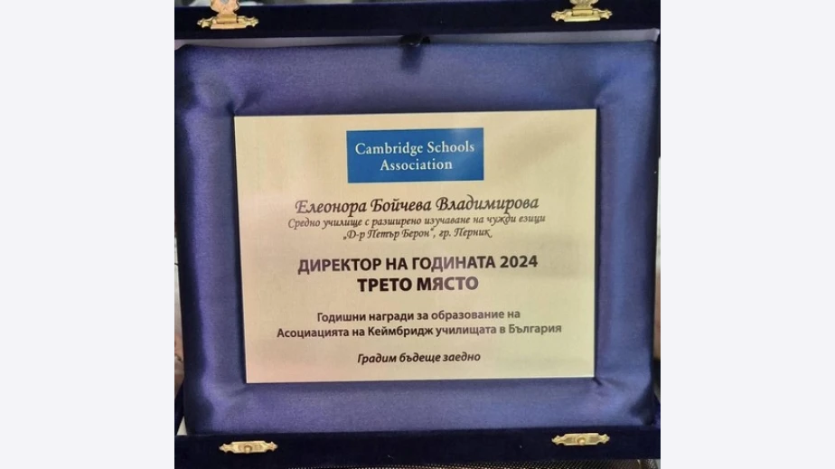 Директорът на СУРИЧЕ „Д.р Петър Берон“ Елеонора Владимирова бе отличена в престижната класация на Асоциацията на Кеймбридж училищата в България 2024. Тя зае трето място в категорията „Директор на годината“.