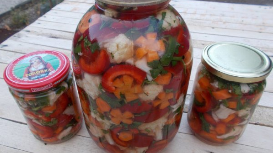 Камбите се почистват от семената и нарязват на резенчета. Карфиолът се накъсва на розички, нарязваме на ситно целина и пресен магданоз. Всички зеленчуци се разбъркват с ръце да се смесят.