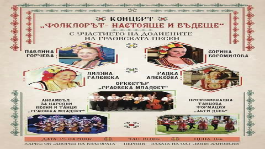 Концертът е наречен „Фолклорът – настояще и бъдеще“. Изпълнителите ще се качат на сцената на театъра в Двореца на културата. Перничани ще се насладят на изпълненията на Павлина Горчева, Сорина Богомилова, Лиляна Галевска, Радка Алексиева, оркестър „Граовска младост“, ансамбълът за народни песни и танци „Граовска младост“ и професионалната танцова формация „Асти денс“.
