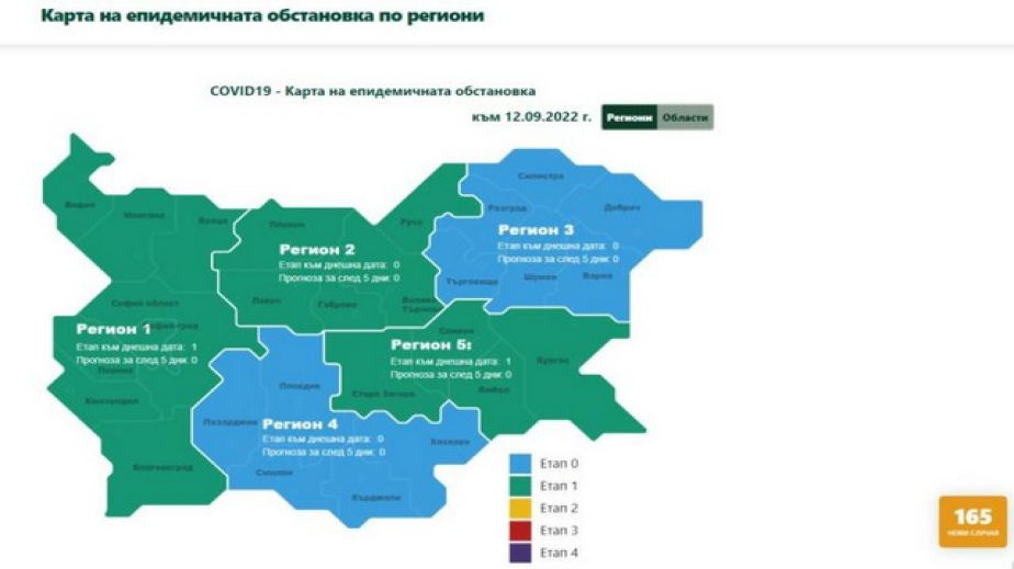 Картата на епидемичната обстановка по региони остава без промяна. Североизточният Регион 3 и южният централен регион 4 са в нулевия етап. Останалите са в зеления Етап 1, но се очаква до 5 дни и те да преминат в нулевия.