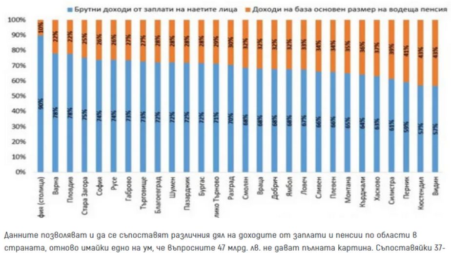 Разпределението на въпросните близо 37 млрд. лв. брутен доход от заплати на наетите лица в страната сочи, че над 17 млрд. лв. от този доход (46,5%) се формира в София (столица). Далеч назад са Пловдив с почти 3 млрд. лв. (8,1%) и Варна с близо 2,2 млрд. лв. (5,9%). След тях се нареждат Стара Загора и Бургас с по близо 1,5 млрд. лв. (4%) и всички останали области, които са с под 1 млрд. лв. брутни доходи от заплати на наетите лица през 2020 г. Точно това разпределение показва огромното значение на големите икономически центрове за оформянето на регионалната икономическа карта в страната.
